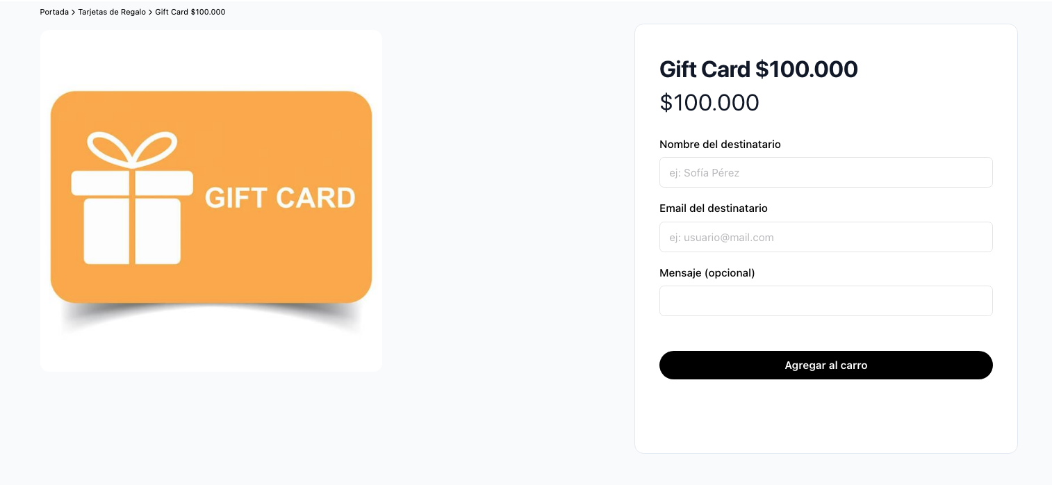 En esta vista, quien compre la Gift Card deberá ingresar nombre y correo del destinatario (a quien le llegará la información para canjear), así como un mensaje opcional para acompañar el regalo.