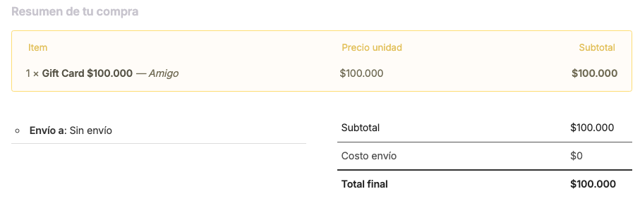 En el carro, así como en el checkout, el cliente podrá comprobar que el destinatario que has ingresado sea el correcto:
