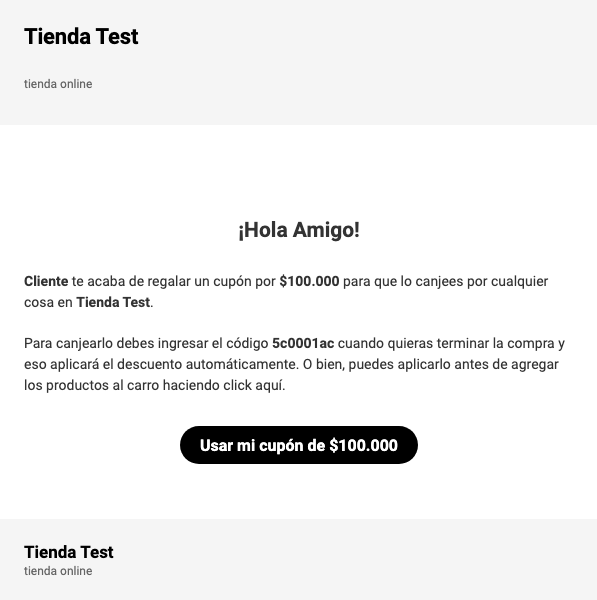 - La tienda donde se compró la giftcard es llamada "Tienda Test", en tu caso, aparecerá el nombre de tu tienda.