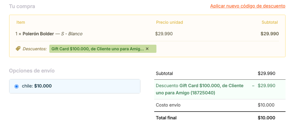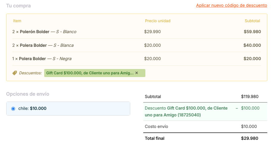 - Si la compra es de un valor igual o superior al monto de la Gift Card, esta se descontará en su totalidad, quedando en el detalle del subtotal solo el monto diferencial + costos de envío.