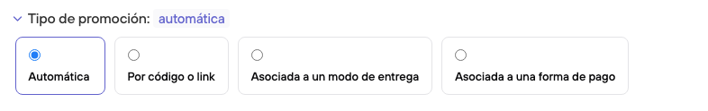 Excepcionalmente, las promociones con modo de activación "Automática" permiten acumular múltiples promociones bajo el mismo modo de activación siempre y cuando todas estén asociadas a un grupos de productos distintos.