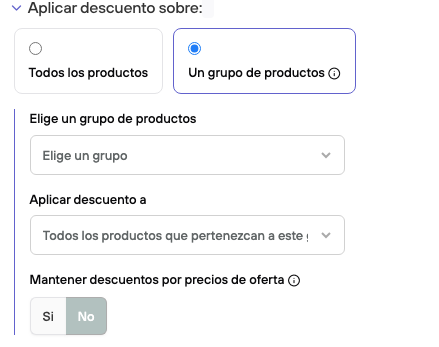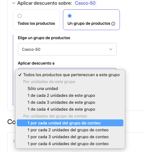 El primero define a que grupo se asocia la promoción: pueden ser productos del tipo "Casco", productos de una colección donde existan estos cascos, ya que puedes desear no aplicar el descuento a todos o a partir del uso de una etiqueta en específico, por ejemplo: "casco-50". También pueden ser marcas, pero es probable que la marca no solo venda "cascos".