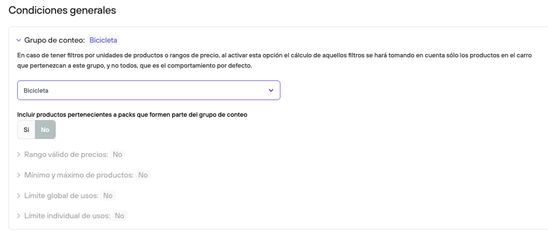 En caso de tener filtros por unidades mínimas y máximas o rangos de precios, al utilizar esta opción el cálculo de aquellos filtros se hará tomando en cuenta sólo los productos en el carro que pertenezcan a este grupo, y no todos, que es el comportamiento por defecto.