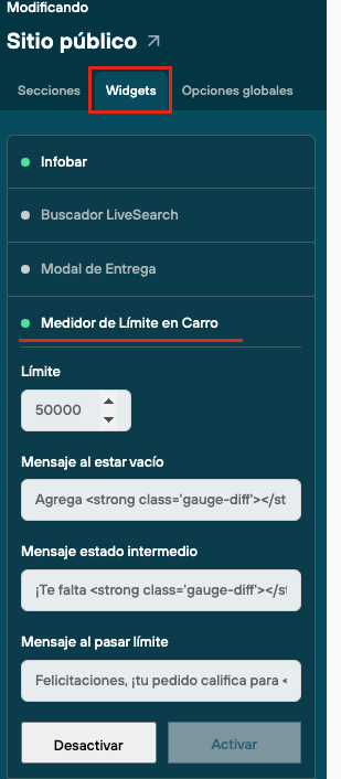 Desde el panel de administración> Diseño > Personalizar diseño actual > Widgets > Medidor de límite en carro. Aquí deberas completar los campos según la información previamente configurada:
