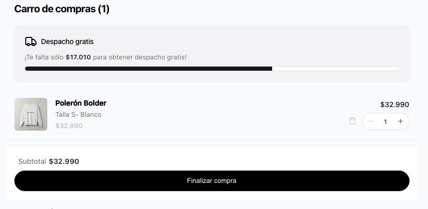 El Medidor de Límite en Carro es un widget nativo de Bolder, diseñado para motivar a tus clientes a completar su compra y aumentar el valor promedio del pedido.