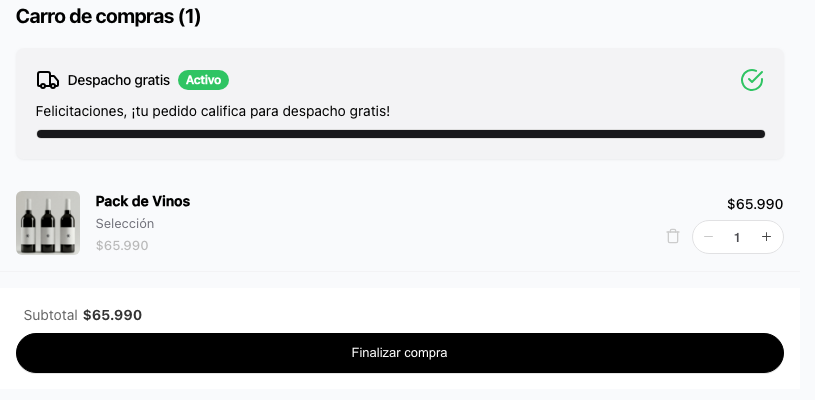 Mensaje estado intermedio: Aparece cuando el cliente ya tiene productos en su carrito, pero aún no alcanza el monto mínimo definido en el límite. Este mensaje se actualiza automáticamente según el valor actual del carrito y muestra cuánto le falta al cliente para obtener el beneficio.